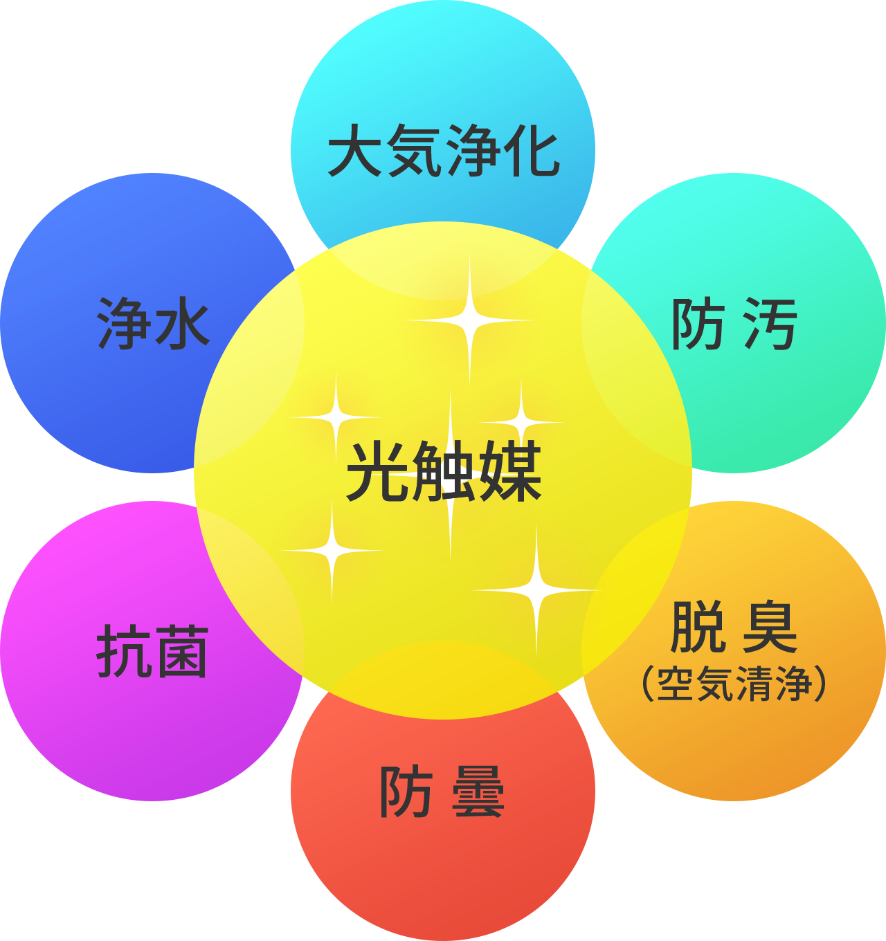 カビ、細菌などの微生物やウイルスは、酸化チタン粒子表面で酸化され、死滅若しくは不活性化します。